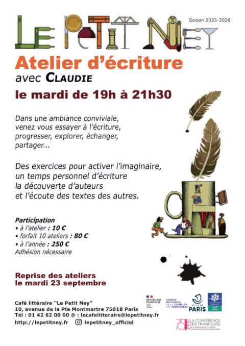 Dans une ambiance conviviale, venez vous essayer à l’écriture, progresser, explorer, échanger, partager... Des exercices pour activer l’imaginaire, un temps personnel d’écriture, la découverte d’auteurs et l’écoute des textes des autres.