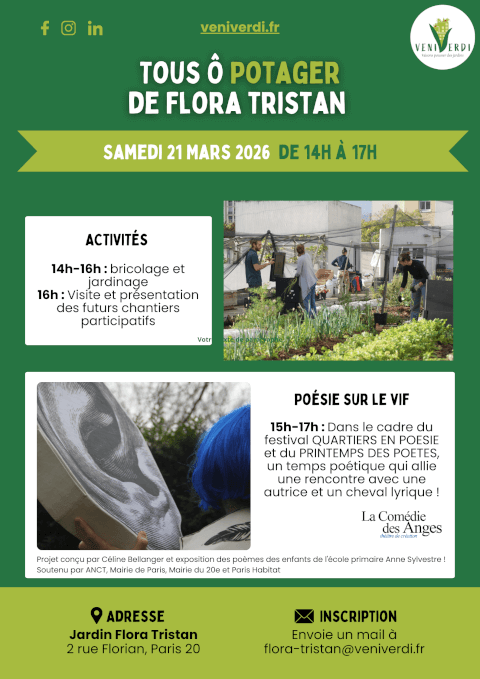 Venez découvrir le potager sur le toit du collège Flora Tristan et nous aider à jardiner et bricoler le temps d'une après-midi ! Exceptionnellement, dans le cadre du festival QUARTIERS EN POESIE et du PRINTEMPS DES POETES, ce temps de jardinage sera accompagné d'un temps poétique qui allie une rencontre avec une autrice et un cheval lyrique.